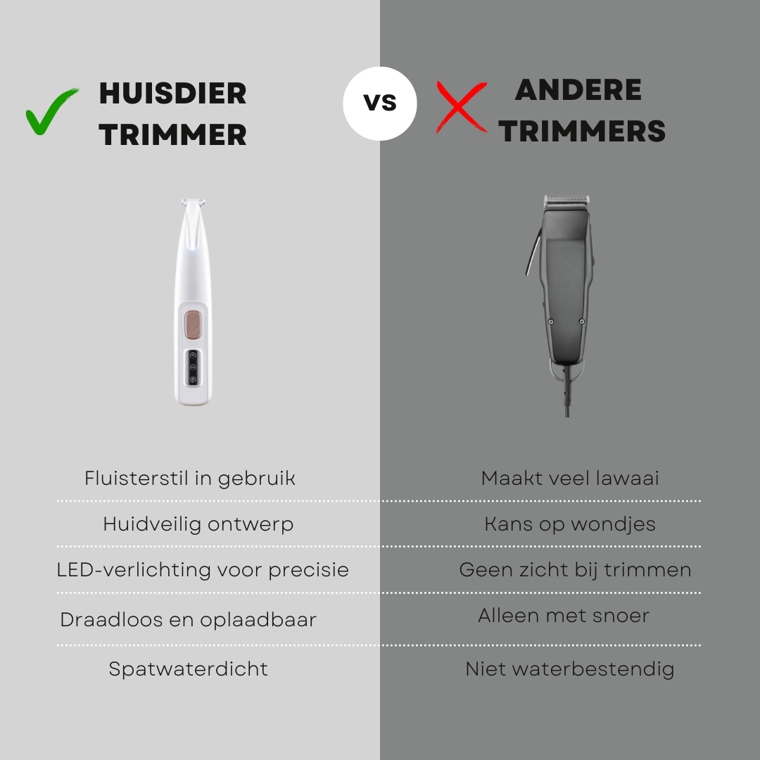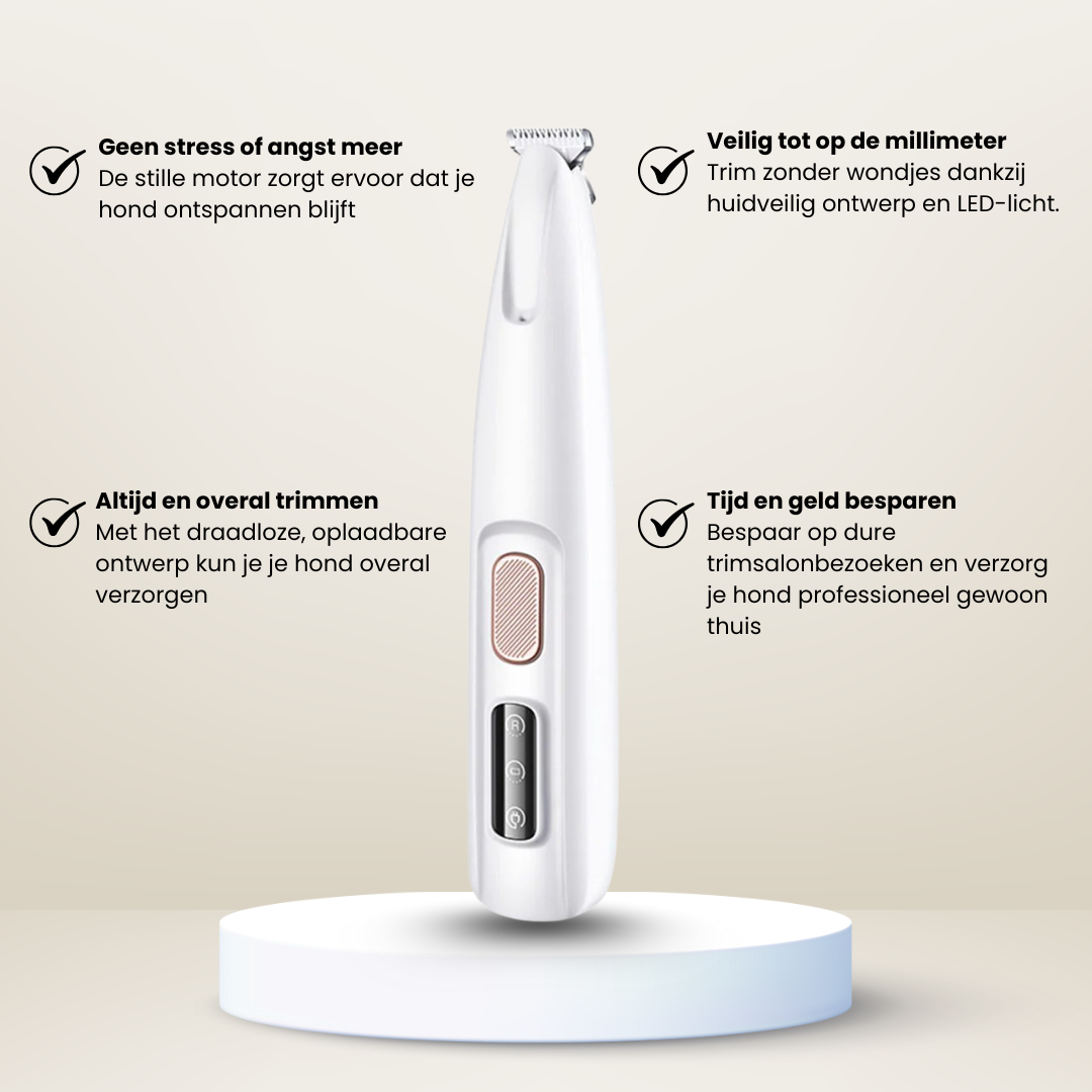 Ontdek onze revolutionaire oplossing voor het veilig en moeiteloos trimmen van vacht. Geen stress meer voor je viervoeter en geen zorgen voor jou. De PetTrim Pro is speciaal ontworpen om zelfs gevoelige plekjes zoals poten, oren en snuit pijnloos en nauwkeurig te verzorgen. Geef jouw huisdier de liefdevolle verzorging die hij verdient.